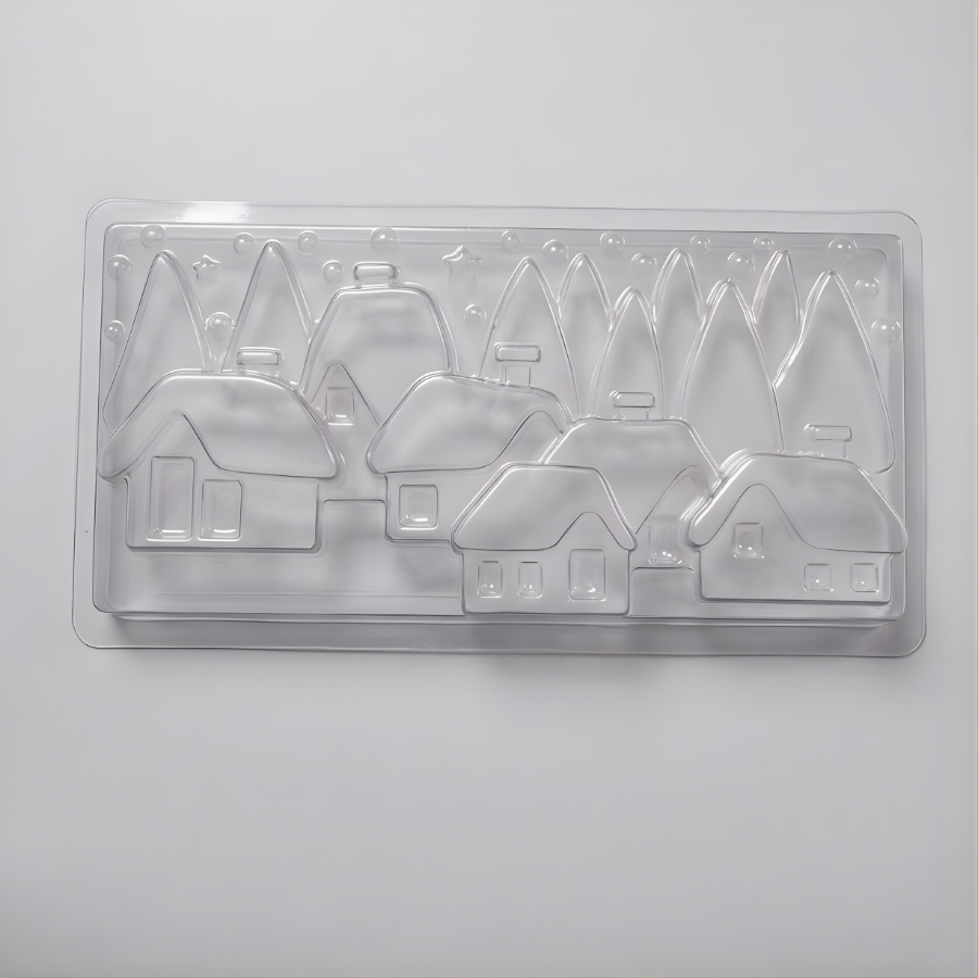 A Forma de Acetato Especial – Cidade Natal é uma excelente escolha para criar peças de confeitaria com um visual temático e encantador. Inspirada em uma cidade natalina, ela permite produzir chocolates e outras criações com detalhes que remetem ao clima mágico das festas de fim de ano, tornando cada preparação ainda mais especial.
