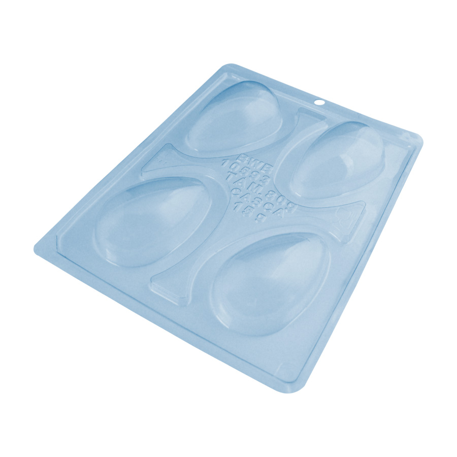 Forma de acetato especial Ovo liso casca fina 80g, com 4 cavidades. A forma especial inclui 3 partes, sendo elas: 2 partes rígidas e 1 flexível.