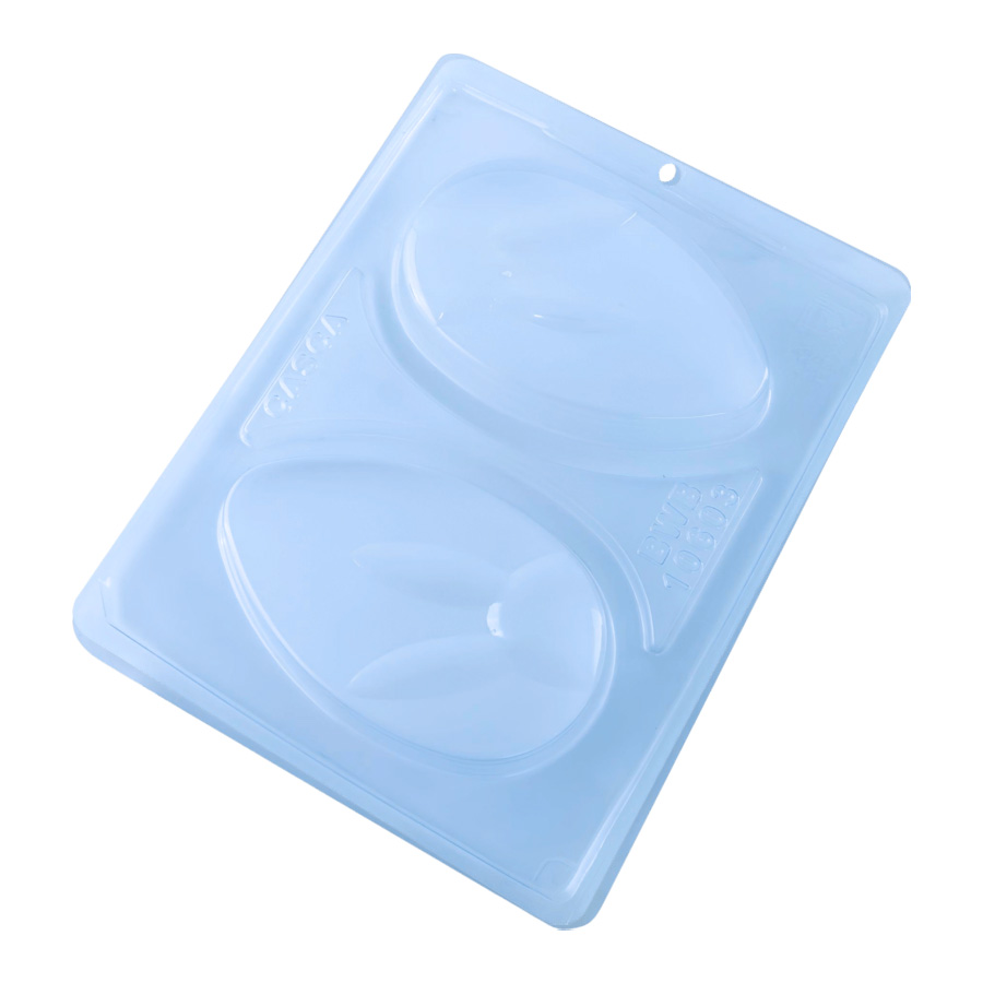 Forma de acetato especial Tablete Ovo Coelho, com 2 cavidades. A forma especial inclui 3 partes, sendo elas: 2 partes rígidas e 1 flexível.