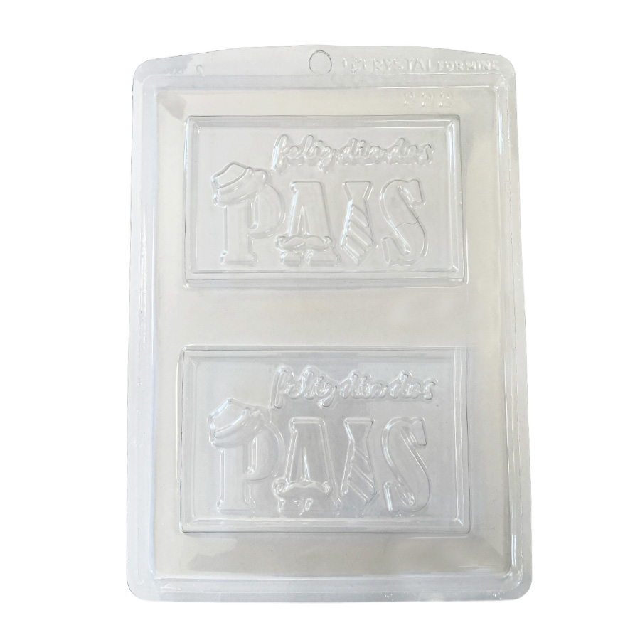 Forma de acetato com duas cavidades retangulares com escrito ''Feliz Dia dos Pais'' com a palavra ''pais'' decorada com chapéu, gravata e bigode