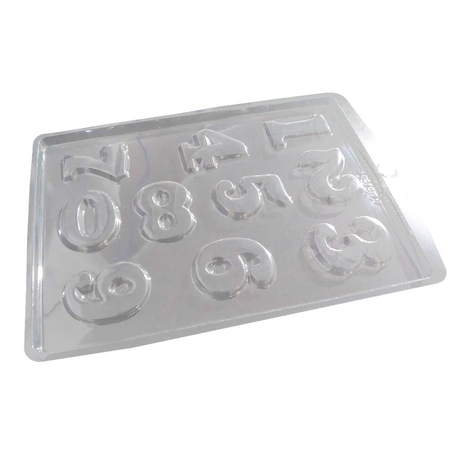 Forma de Acetato Números - Ref. 130 A, ideal para moldar chocolates em formato de números com precisão e praticidade.