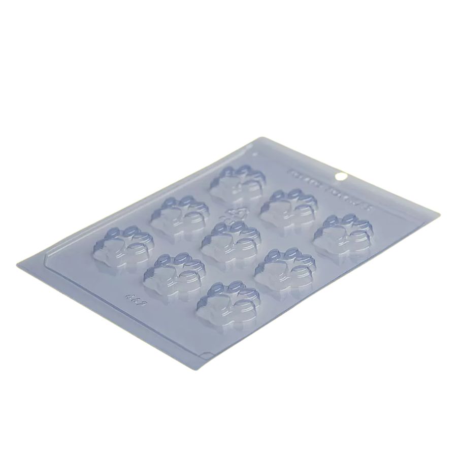 Forma de acetato para chocolates temáticos em formato de patinhas, garantindo charme e perfeição nos detalhes.
