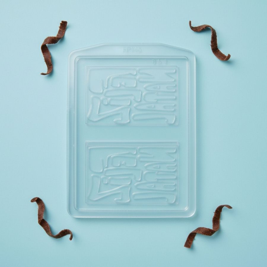 Forma descartável retangular com 2 cavidades para chocolate, prática e funcional, ideal para produção rápida e padronizada.