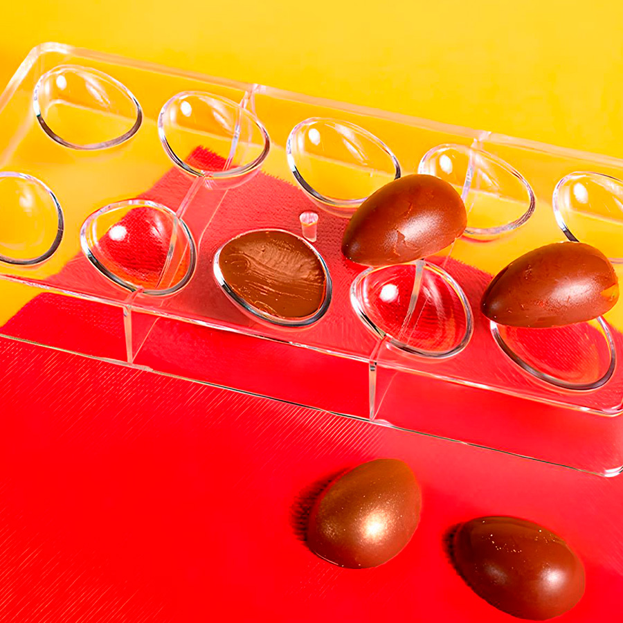 Forma profissional para chocolate, de material resistente transparente. 10 cavidades para ovinhos de 20g
