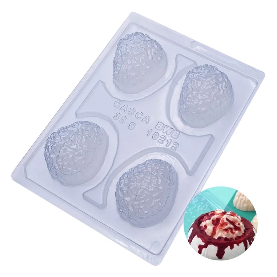 A Forma Especial de Acetato Cérebro 3 Partes, que são duas rígidas e uma flexível, é perfeita para confeiteiros que desejam criar chocolates ocos de forma prática e profissional. Produzida em acetato resistente com encaixe de silicone, possui 4 cavidades de aproximadamente 7x5,5cm cada, moldando chocolates no formato realista de cérebro — ideal para festas de Halloween, eventos temáticos e lembrancinhas criativas.