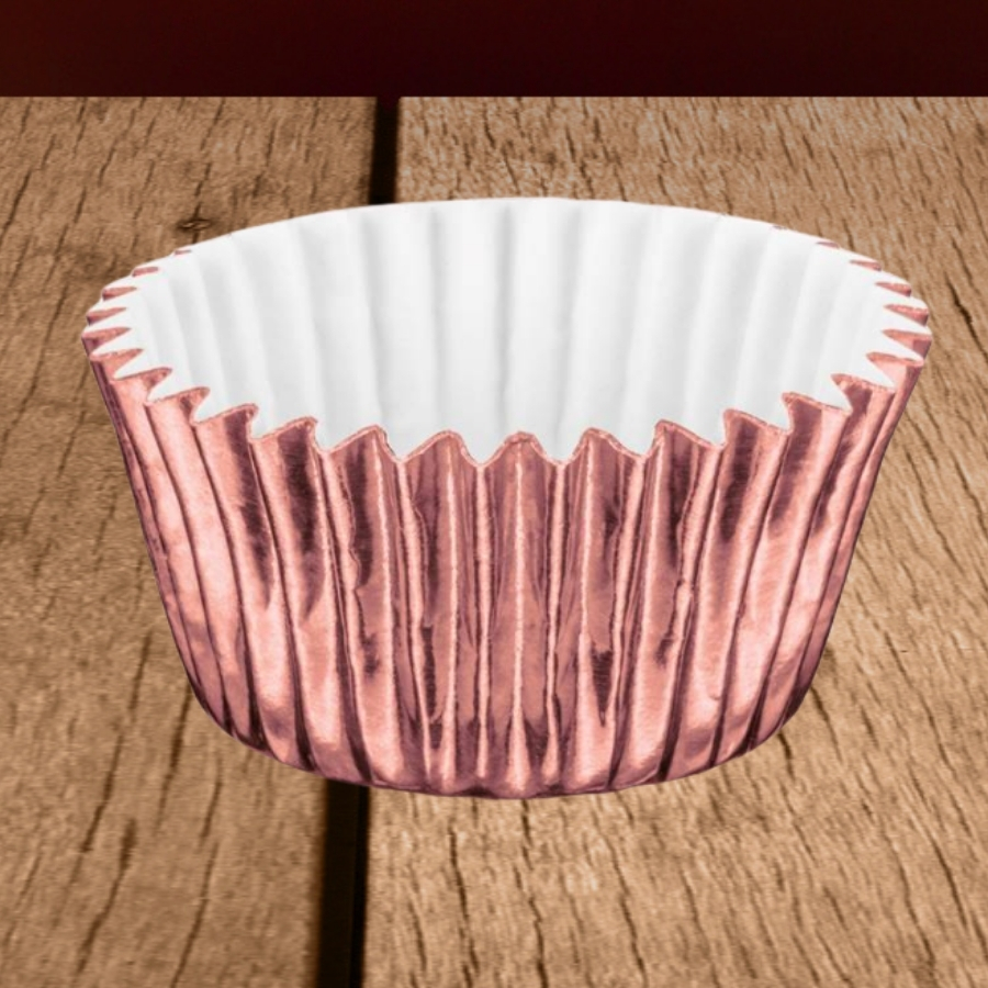 A forminha laminada para doces nº 04 possui acabamento laminado na cor ouro rose e dimensões aproximadas de 2,5x2cm. É indicada para acomodar pequenos doces, auxiliando na organização, padronização e valorização estética das produções de confeitaria.