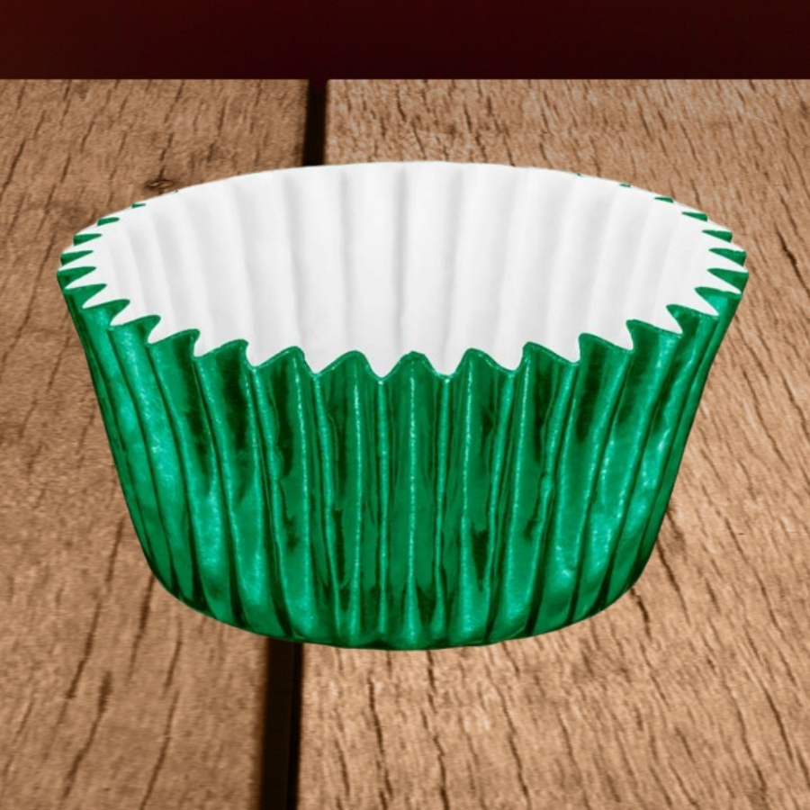 A forminha laminada para doces nº 05 possui acabamento laminado na cor verde escuro e dimensões aproximadas de 2x1,5cm. É indicada para a acomodação e apresentação de pequenos doces, auxiliando na valorização estética e organização das produções de confeitaria.