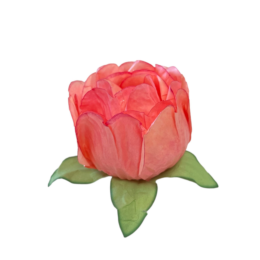 Forminha para doces finos em formato de flor, com pétalas na cor laranja papaya claro, com folhas na cor verde
