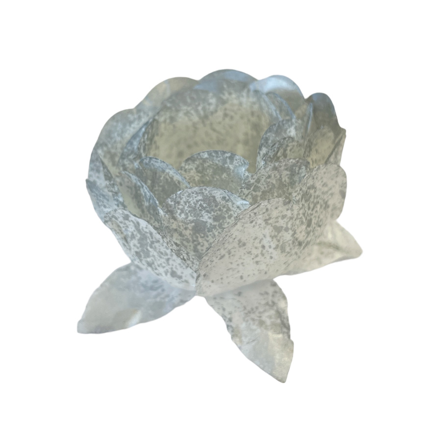 Forminha para doces finos, em formato de flor, com pétalas na cor prata e folhas pratas