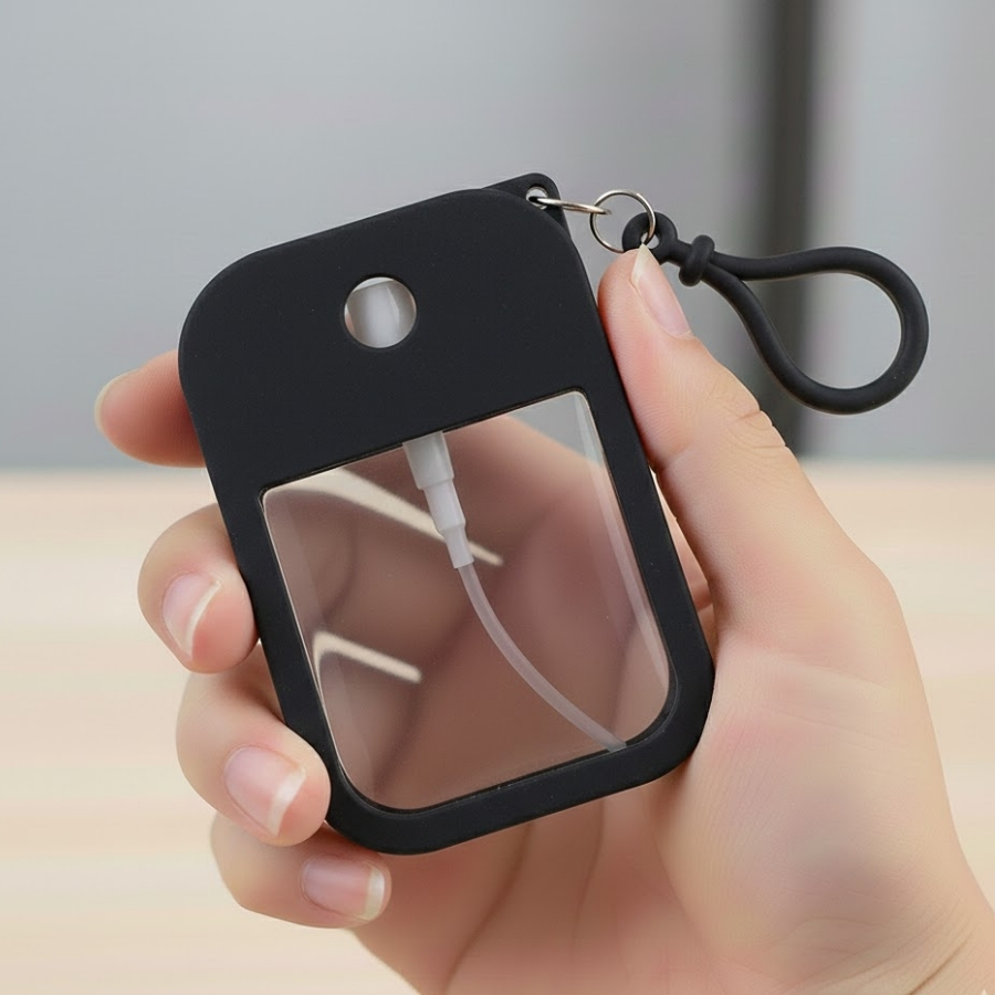 Este é um recipiente pulverizador de design plano, com capacidade de 38ml. Seu bico spray de alta performance garante que o líquido (como álcool 70°) seja dispensado em uma névoa fina. O frasco é revestido por uma capa protetora de silicone na cor Preto, que aumenta a durabilidade e oferece uma pegada segura. O gancho acoplado transforma-o em um spray para bolsa de acesso imediato. Por ser totalmente recarregável, é uma alternativa prática e sustentável para o transporte de fluidos de baixa viscosidade.