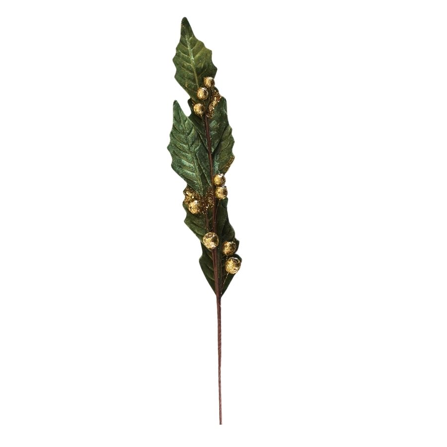 Esse galho decorativo com frutas é ideal para quem busca uma decoração marcante e luxuosa. Seus elementos em dourado misturados ao verde criam uma atmosfera de requinte, ideal para árvores de Natal, arranjos de mesa e guirlandas.