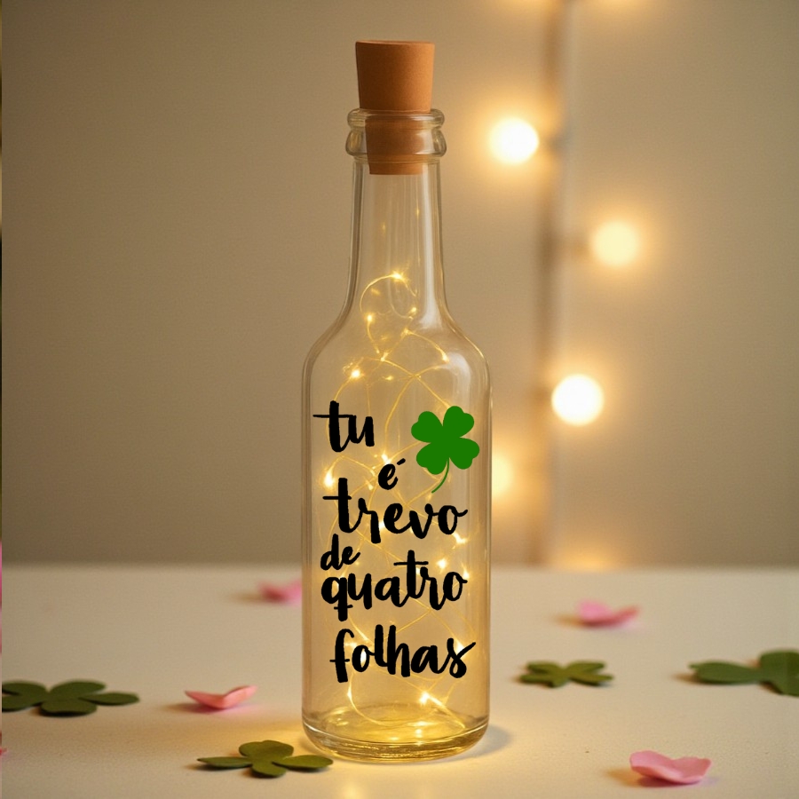 Celebre o amor de forma única com a Garrafa de Vidro Long Neck com Rolha LED - Trevo de Quatro Folhas. Esta encantadora garrafa de vidro long neck foi especialmente personalizada para o Dia dos Namorados, tornando-a o presente perfeito para seu parceiro(a) nesta data tão especial.