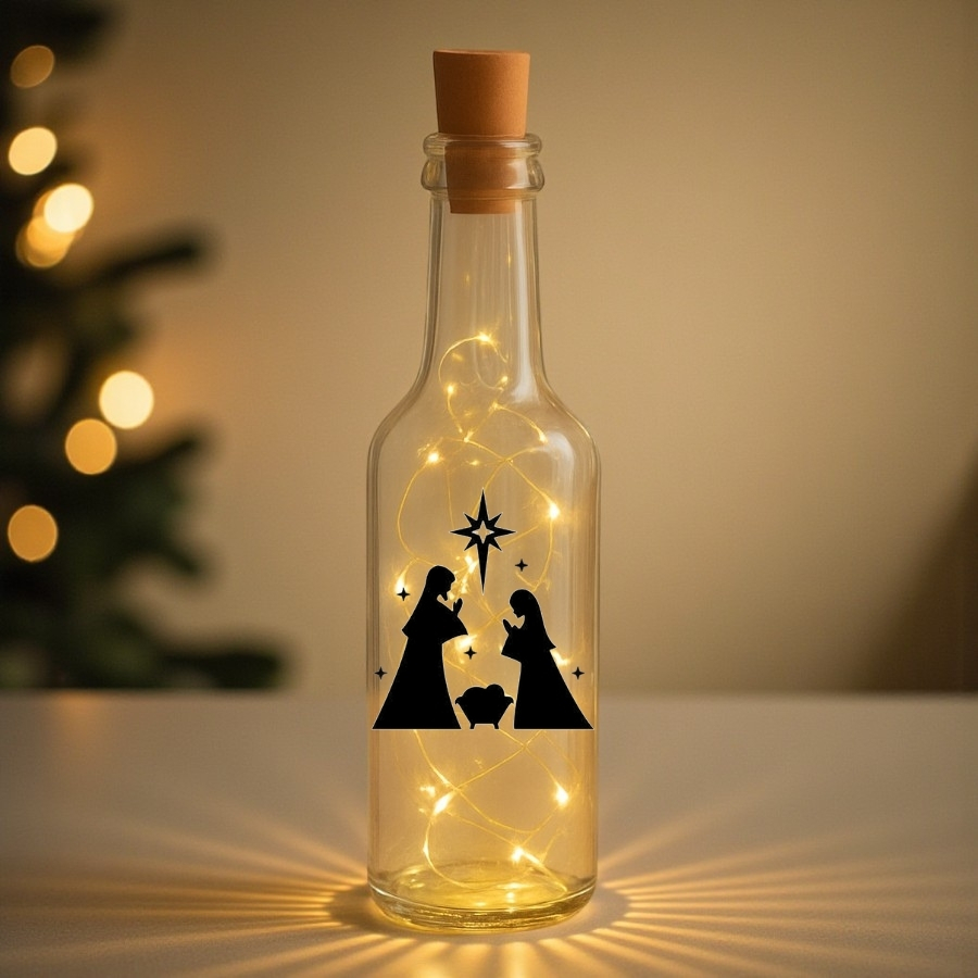 Garrafa de vidro com um vinil adesivo personalizado Sagrada Família. Contém uma rolha com fio de LED para colocar no interior da garrafa.