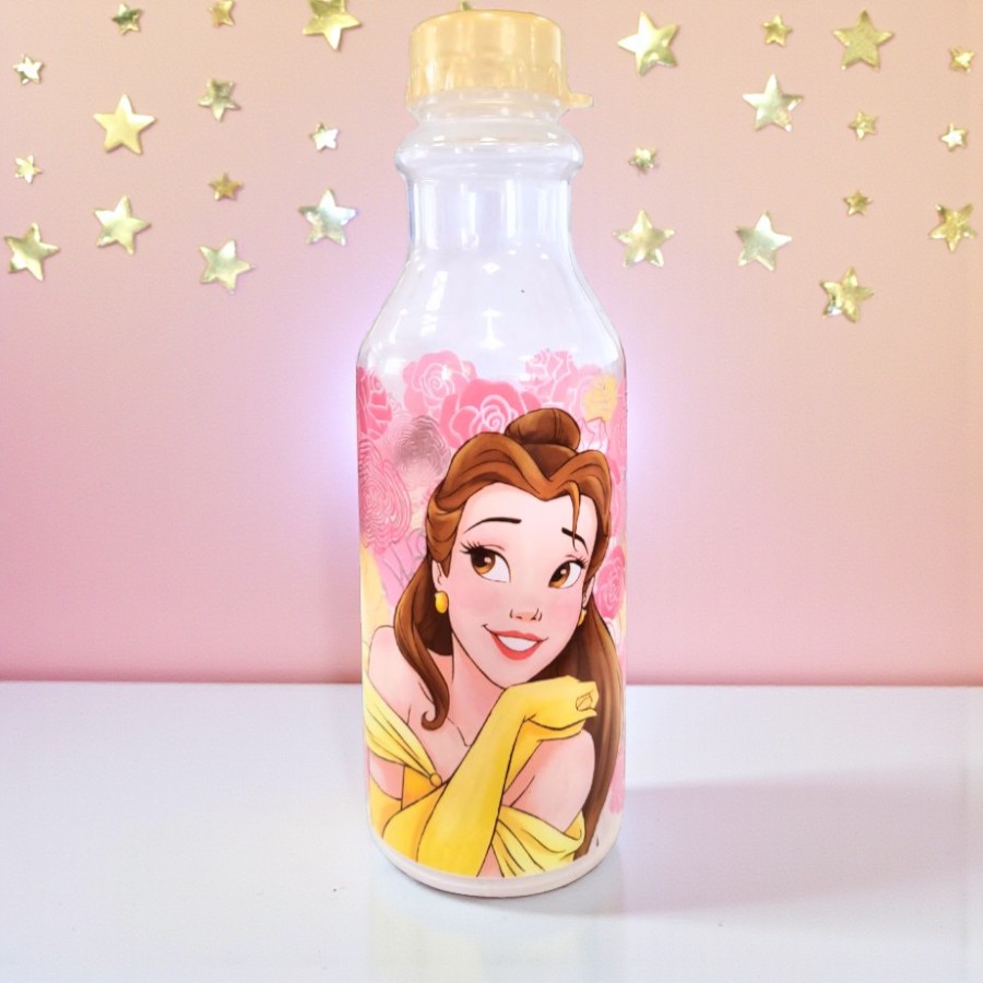 Garrafa de plástico transparente, com estampa inspirada em Bela Disney