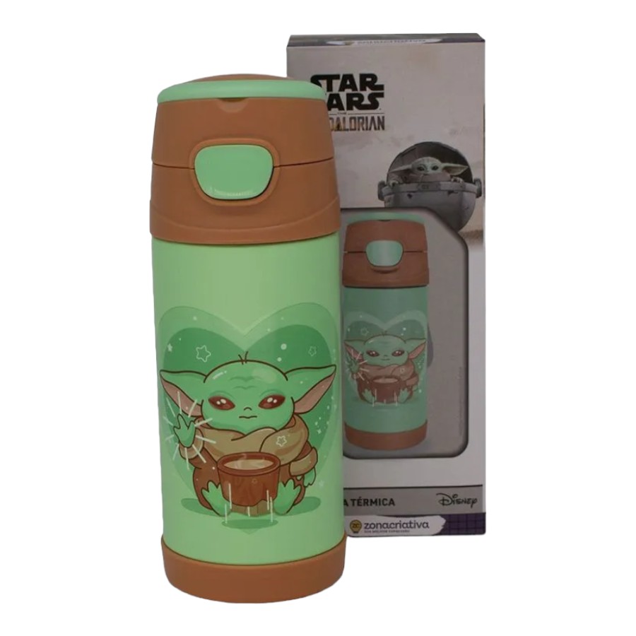 Garrafa Térmica, de 350ml, mantendo temperatura, 12 horas de bebidas geladas e 10 horas de bebidas quentes, com cores e estampa temática do baby yoda