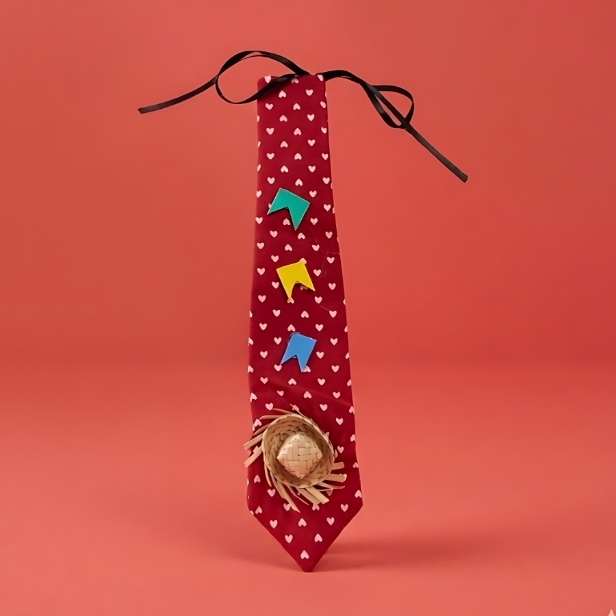 Trata-se de uma gravata de festa junina na cor vermelha com estampa de corações, medindo 30cm. Indicada para uso decorativo. Não há informações no título sobre material, tipo de fixação ou resistência a fatores externos. Recomenda-se evitar contato com umidade e manusear com cuidado para preservar suas características.
