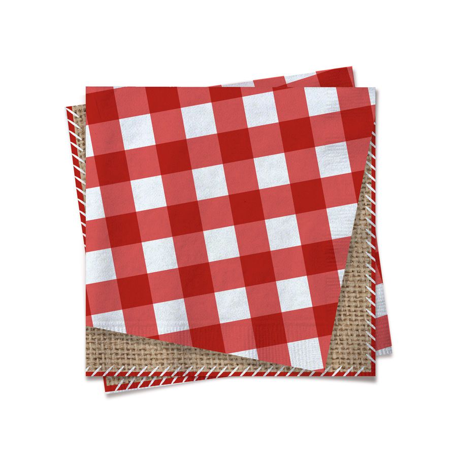 Guardanapo de papel com estampa xadrez branco e vermelho, com estampa ilusória de fundo de tecido em juta por trás do xadrez