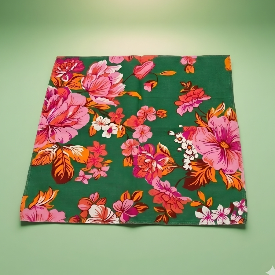 Guardanapo confeccionado em tecido tipo chita, com estampa verde e flores rosa. Possui dimensões aproximadas de 40cm de largura e 40cm de comprimento. Indicado para uso decorativo e funcional em mesas. Por se tratar de material têxtil, pode apresentar variações de tonalidade e estampa. Recomenda-se evitar contato com umidade excessiva e realizar limpeza de forma adequada para preservar o tecido.
