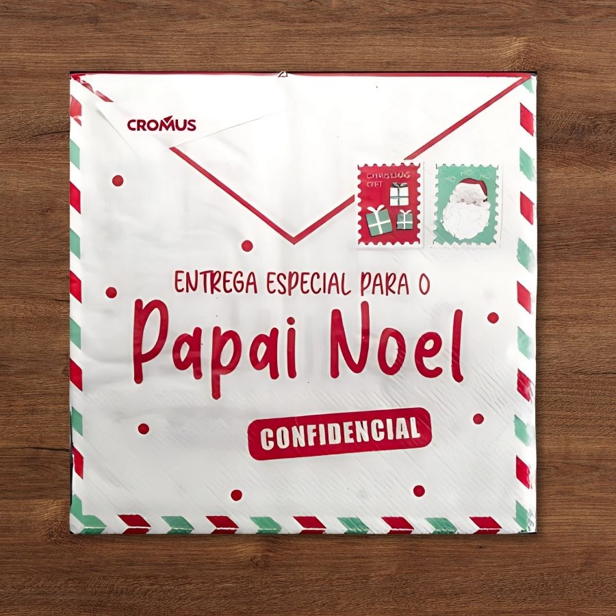 Guardanapo de Papel Natalino medindo 32,5x32,5cm, com estampa temática de envelope do Papai Noel. Produto descartável, indicado para uso em ceias, festas e eventos natalinos, oferecendo praticidade e um toque de criatividade à decoração da mesa.