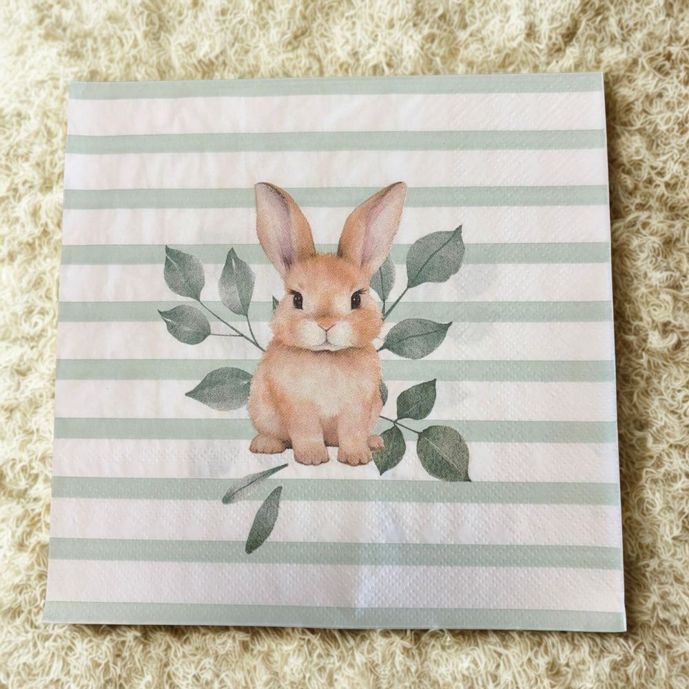 O Guardanapo de Páscoa com estampa de coelho é ideal para criar uma mesa delicada e cheia de charme. O design apresenta um coelhinho com listras verdes em tom pastel, que se destacam suavemente sobre o fundo branco, acompanhadas de folhas verdes simples que completam a composição com leveza e harmonia. Um visual fresco, elegante e perfeito para a Páscoa.