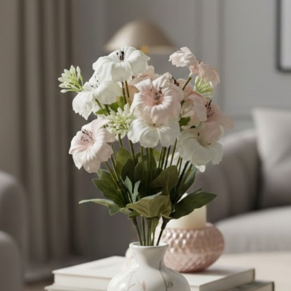 Delicado e elegante, o galho decorativo de Petúnia Creme Rosa é perfeito para trazer leveza e sofisticação à decoração. Com flores em tons suaves de creme e rosa, a peça reproduz com charme o visual natural da petúnia, adicionando um toque romântico e acolhedor aos ambientes. Seu acabamento cuidadoso garante um aspecto realista, ideal para composições decorativas duráveis.