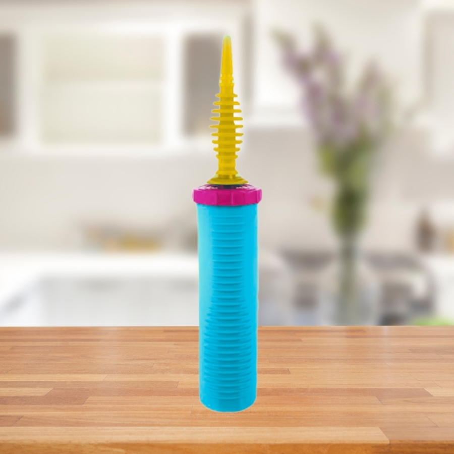 Fabricado em plástico resistente, possui base azul e bico amarelo, com 27,5cm de comprimento e 4,5cm de diâmetro. Seu sistema de bombeamento bidirecional infla o balão tanto ao empurrar quanto ao puxar, garantindo maior eficiência no uso.