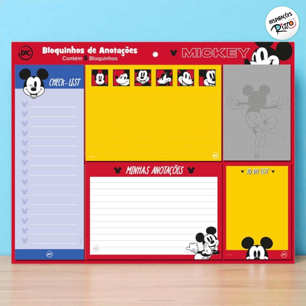 Kit 5 Blocos de Anotações - Mickey Mouse Este kit contém 5 blocos de anotações com tamanhos variados e folhas decoradas com estampa do Mickey Mouse. Cada bloco possui 20 folhas coloridas com diferentes estilos: checklist, quadriculado, pontilhado, to do list e espaço para anotações gerais. Ideal para organizar tarefas, estudos, recados e inspirações do dia a dia.