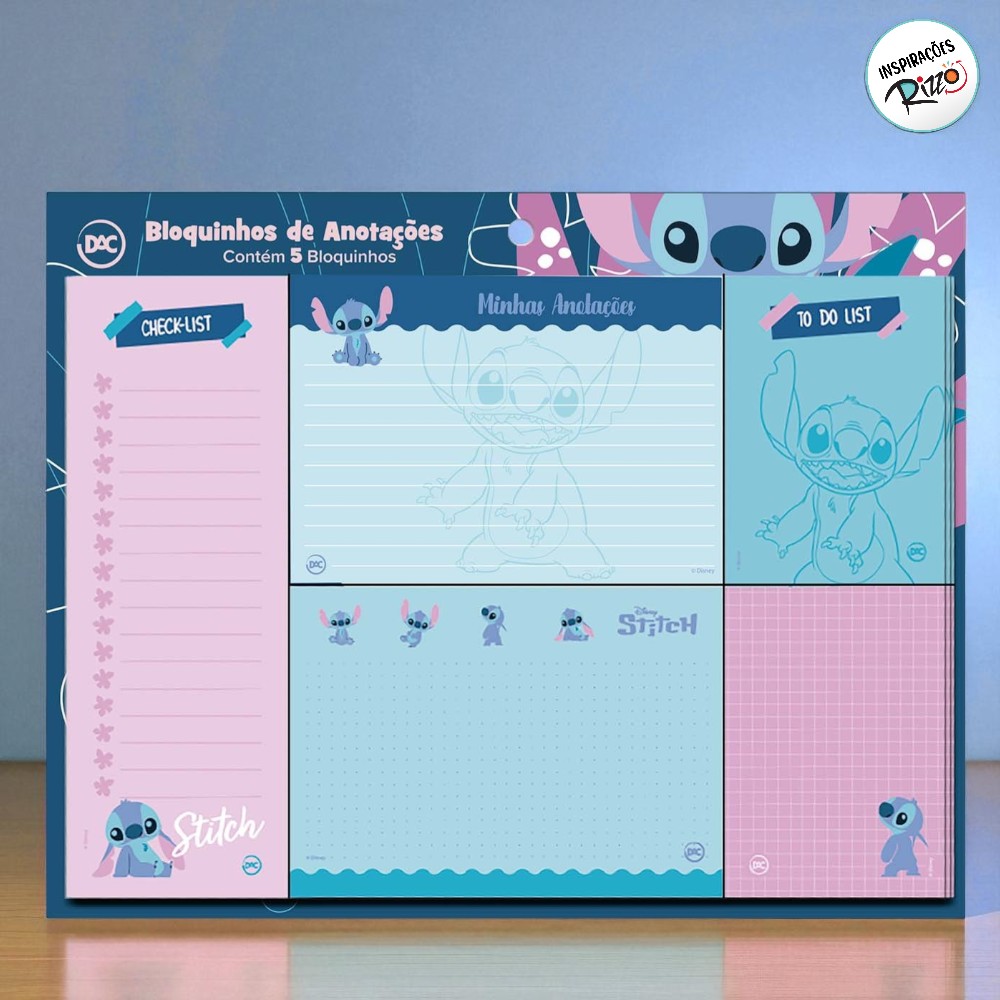Kit 5 Blocos de Anotações - Stitch Disney Composto por 5 blocos de anotações em tamanhos variados, este kit traz o divertido Stitch Disney em diferentes estilos de páginas: checklist, quadriculado, pontilhado, to do list e anotações gerais. Cada bloco possui 20 folhas decoradas e coloridas com estampas licenciadas Disney.