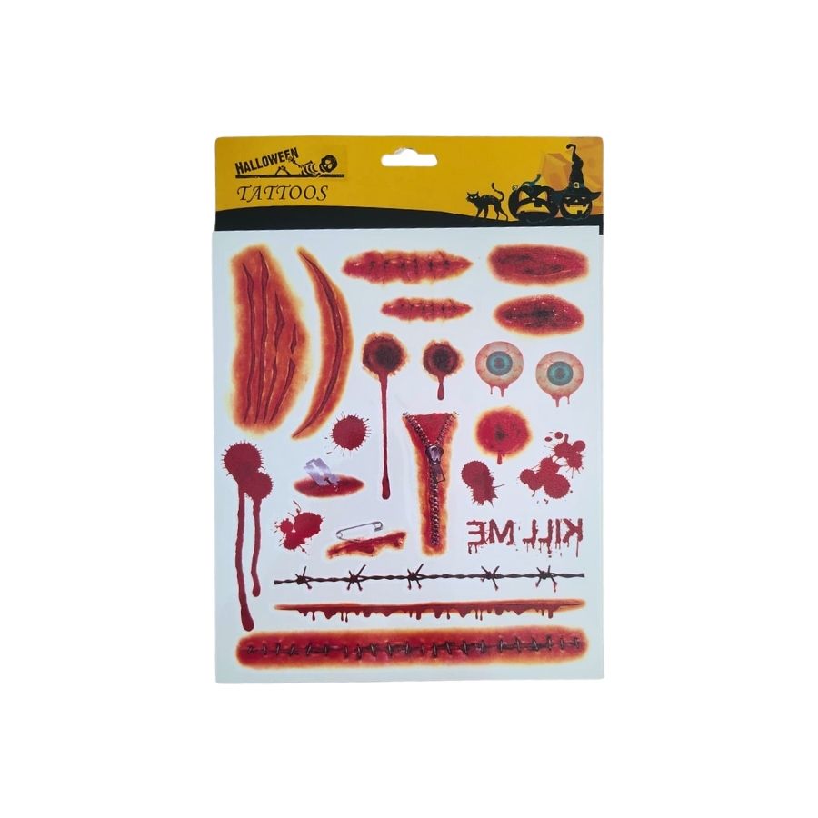 O Kit Adesivo para Pele Halloween, com tatuagens de 2 a 19 cm de olhos, ferimentos e outros detalhes, é perfeito para criar um visual assustador e completo para sua fantasia.
