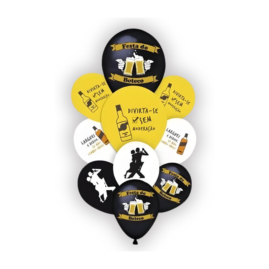 Kit com 10 balões temáticos nas cores preto, branco e amarelo, ideal para decorações divertidas no estilo boteco.