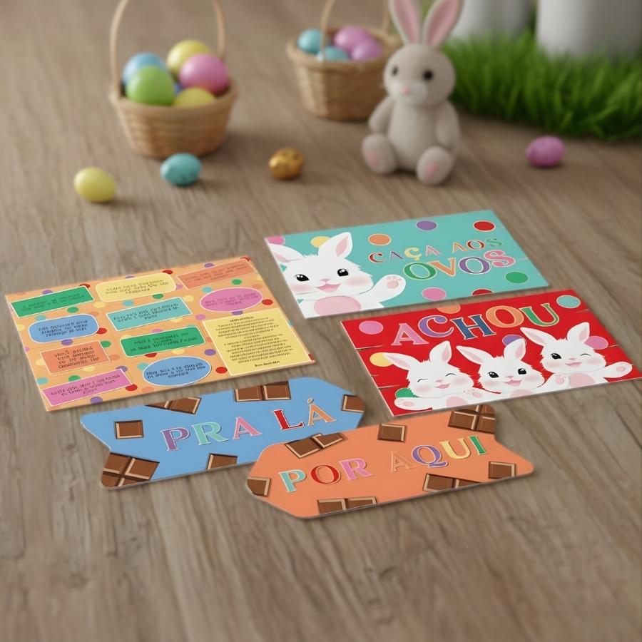 Indicado para famílias, escolas e eventos temáticos de Páscoa, este kit facilita a organização da brincadeira, auxiliando na sinalização dos espaços e na condução da caça aos ovos. Suas dimensões de 26x10cm permitem boa visualização, contribuindo para uma dinâmica mais clara e atrativa.