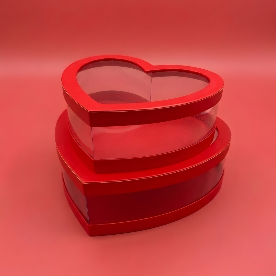 Kit composto por caixa(s) em formato de coração, na cor vermelha, com partes em acetato transparente. Indicado para acondicionamento e apresentação de presentes. A quantidade de itens no kit não é especificada no título. Produto de uso decorativo. Recomenda-se evitar contato com umidade e manusear com cuidado para preservar a transparência do acetato e a integridade da estrutura.