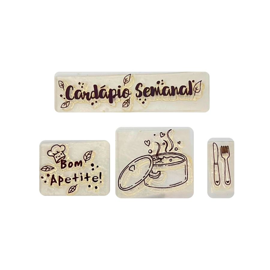 O Kit Cartela de Carimbos - Bom Apetite M foi desenvolvido especialmente para quem ama o universo da gastronomia e deseja adicionar um toque artesanal e criativo às suas produções. Com desenhos e frases temáticas relacionadas à culinária, esse kit é perfeito para personalizar embalagens, etiquetas, menus, planners, cadernos de receitas e muito mais.