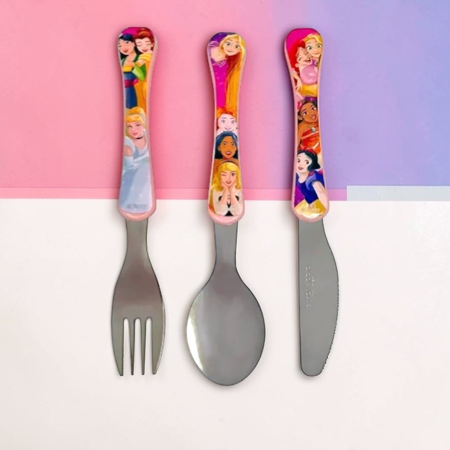 A faca possui cantos arredondados, proporcionando mais segurança no uso infantil. O cabo é em plástico livre de BPA e os talheres são em aço inoxidável, unindo praticidade e funcionalidade para o dia a dia. Pode ser combinado com copos, pratos, potes e lancheiras do tema já trabalhados no portfólio, criando uma composição harmoniosa para escola, passeios ou uso em casa. A proposta integra utilidade e organização com o encanto das Princesas Disney.