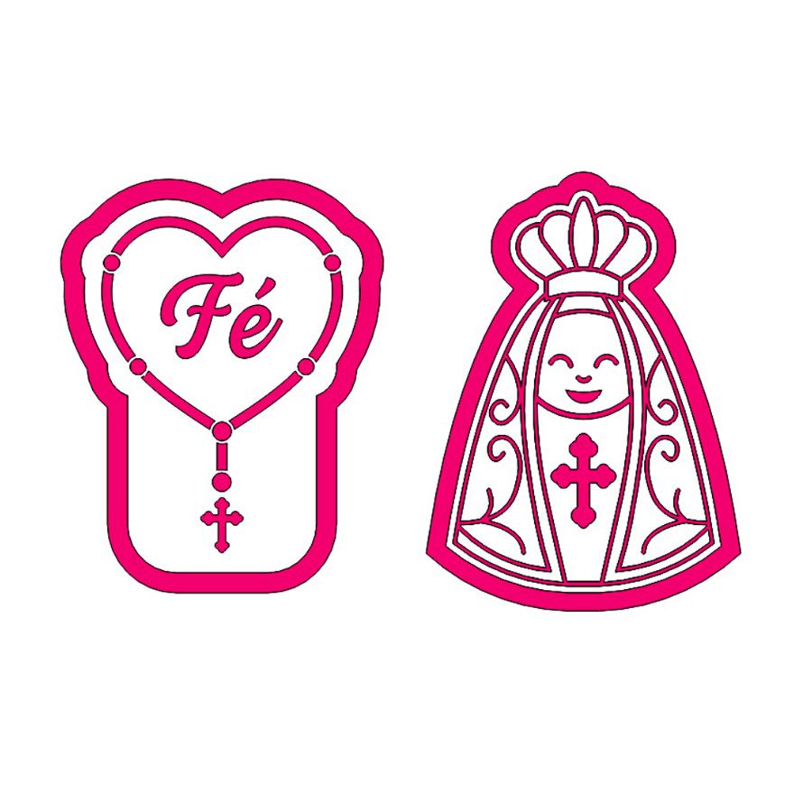 Kit de Cortadores e Carimbos na cor rosa, no tema Nossa Senhora, contem um da Nossa Senhora e um com coração de terço e escrito Fé.