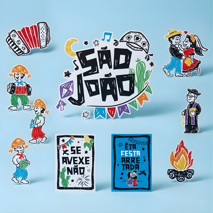 Kit decorativo com temática Cordel de São João, com dimensões aproximadas de 46x43cm. Indicado para uso em decoração de festas juninas e eventos temáticos, podendo ser aplicado em paredes, painéis ou superfícies semelhantes para compor a ambientação do espaço. Produto destinado exclusivamente à decoração. Recomenda-se evitar contato com umidade e manusear com cuidado para preservar o material.