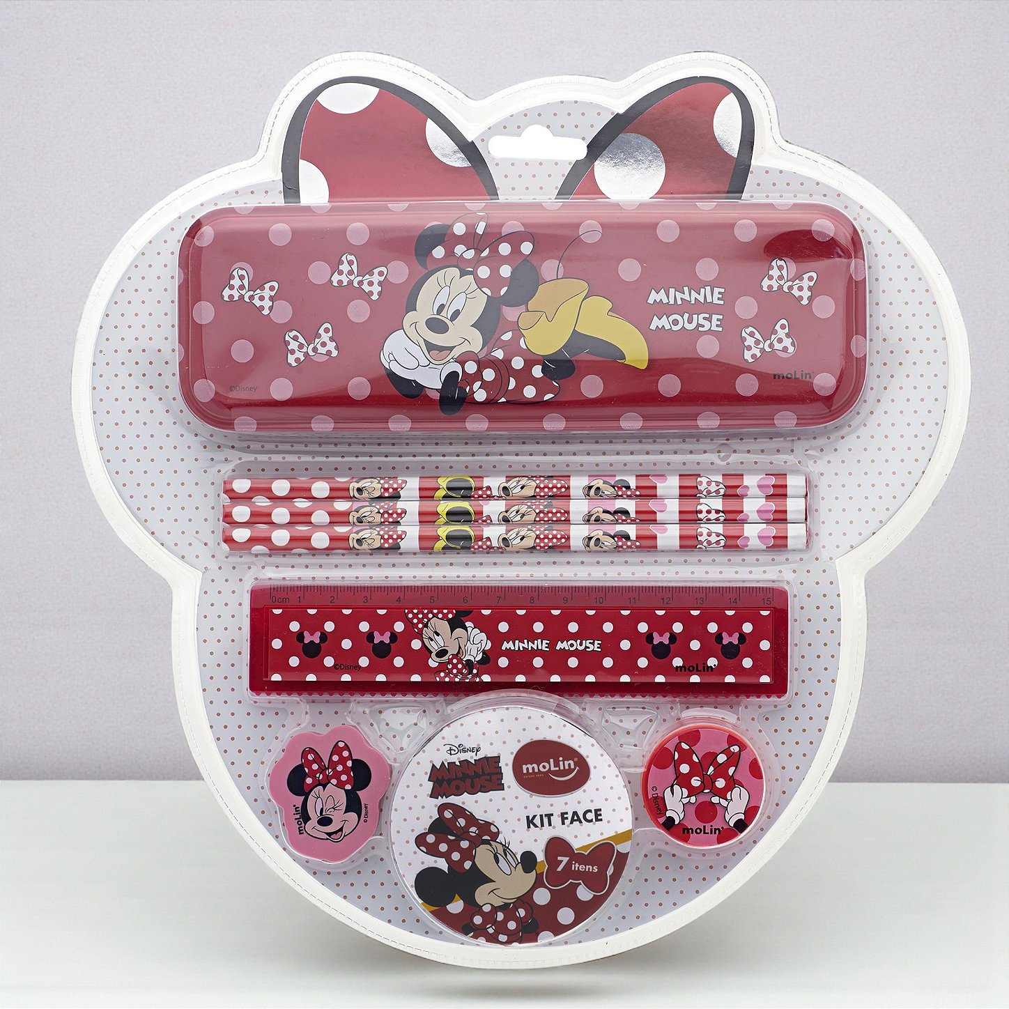 Kit Escolar - Minnie Mouse - 7 Itens Minnie Mouse Disney é uma escolha prática e encantadora para a rotina escolar, reunindo itens essenciais em um único conjunto. O kit é composto por um estojo metálico, três lápis pretos HB, uma borracha, um apontador e uma régua, facilitando o uso diário em sala de aula, tarefas em casa e atividades de escrita. O visual temático da personagem valoriza o design do conjunto, tornando o material mais atrativo e organizado. É ideal para quem busca praticidade aliada a um visual delicado, além de ser uma ótima opção para composições criativas em Disney festas e kits presenteáveis.