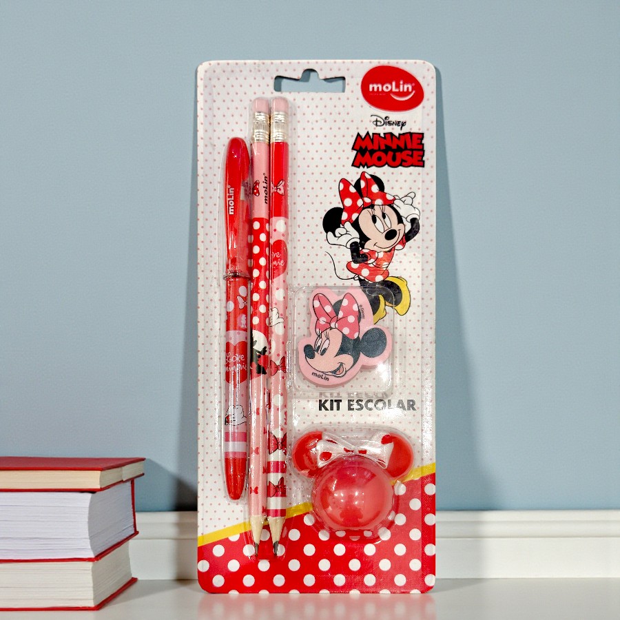 O Kit Escolar com 5 Itens inspirado em Minnie Mouse Disney, na versão rosa, é uma opção prática para organizar a rotina escolar e atividades do dia a dia. O conjunto é composto por 2 lápis pretos HB com borracha na ponta superior, 1 caneta esferográfica de escrita média azul, 1 borracha e 1 apontador funcional, facilitando o uso em sala de aula, tarefas em casa ou momentos de estudo. Sonhar, realizar e comemorar fica mais simples com um kit pensado para o uso diário, disponível na Loja Disney.
