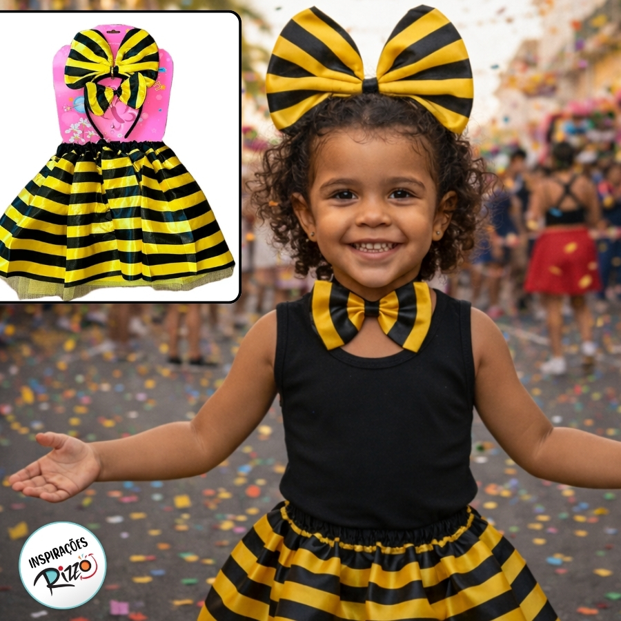 A saia acrescenta um toque de fofura e diversão, enquanto a gravata borboleta e a tiara complementam o visual, transformando você em uma adorável abelhinha pronta para celebrar. Seja para uma festa de Carnaval ou qualquer evento temático, este kit é garantia de diversão e estilo.