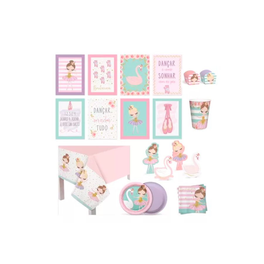 O Kit Festa de Bailarina com 62 peças é uma coleção encantadora e completa que transformará qualquer celebração em um espetáculo de delicadeza e elegância. Projetado para proporcionar uma experiência temática única, este kit inclui uma variedade de itens cuidadosamente escolhidos para criar uma atmosfera mágica de balé.