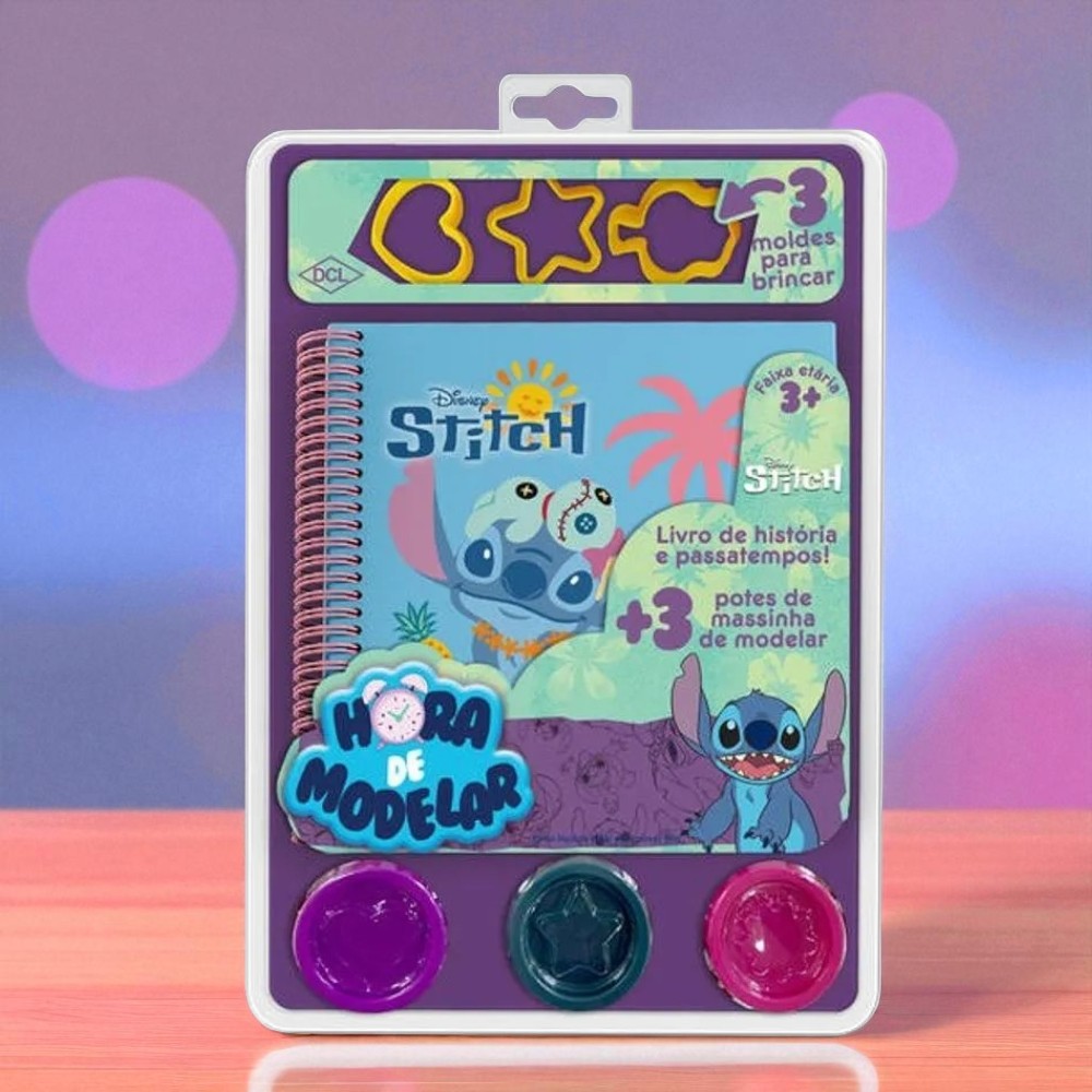 Kit de livrinho de leitura e passatempos, com molde e massinha de modelar, inspirados no Personagem Stitch Disney. Cor dos moldes e massinhas sortidas, não sendo possível a escolha.