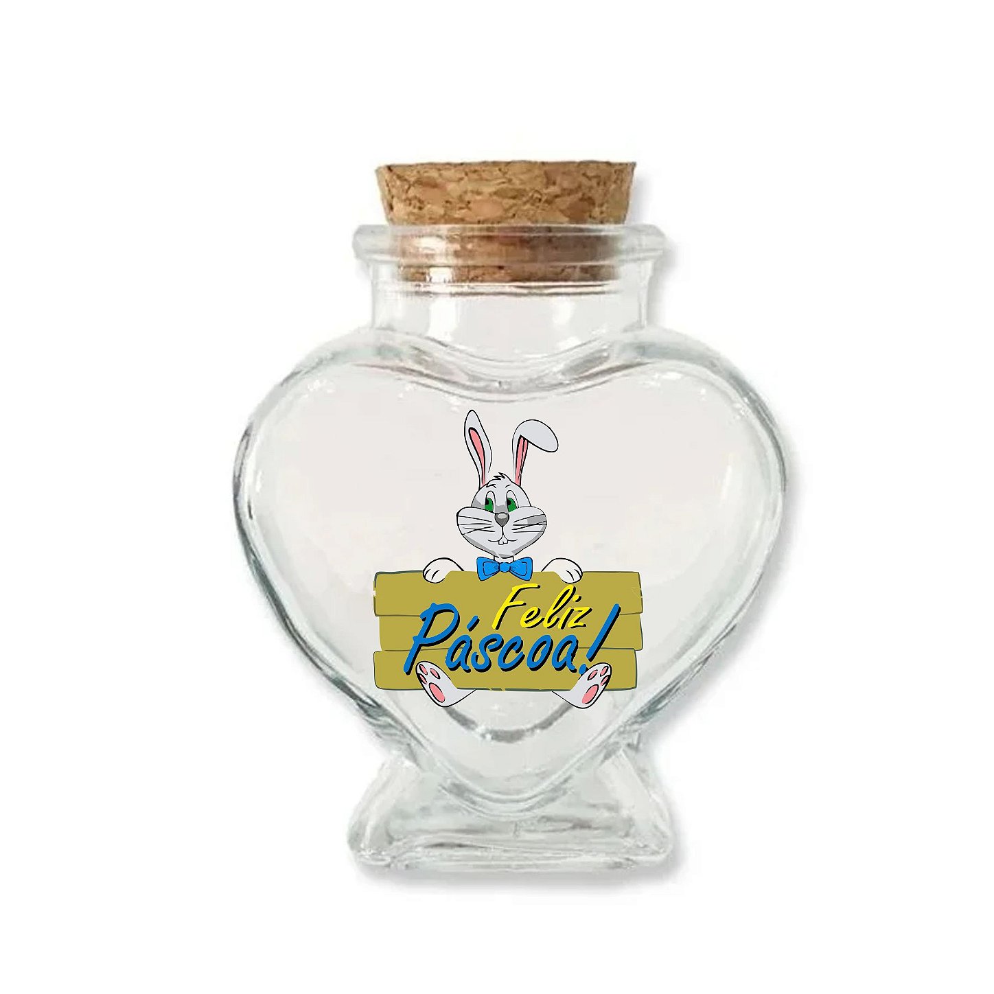 Potinho de vidro em formato de coração com rolha, personalizado para a Páscoa. Capacidade de 70ml. Medidas: 6cm x 7cm.