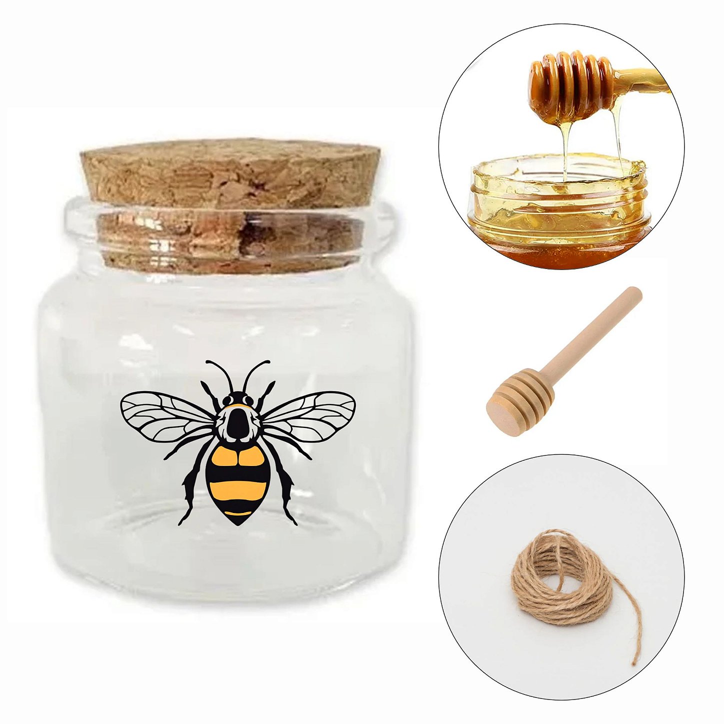 Potinho de vidro com dosador de mel e tampa de rolha, personalizado com tema Abelha. Capacidade de 50ml e altura de 4,5cm.