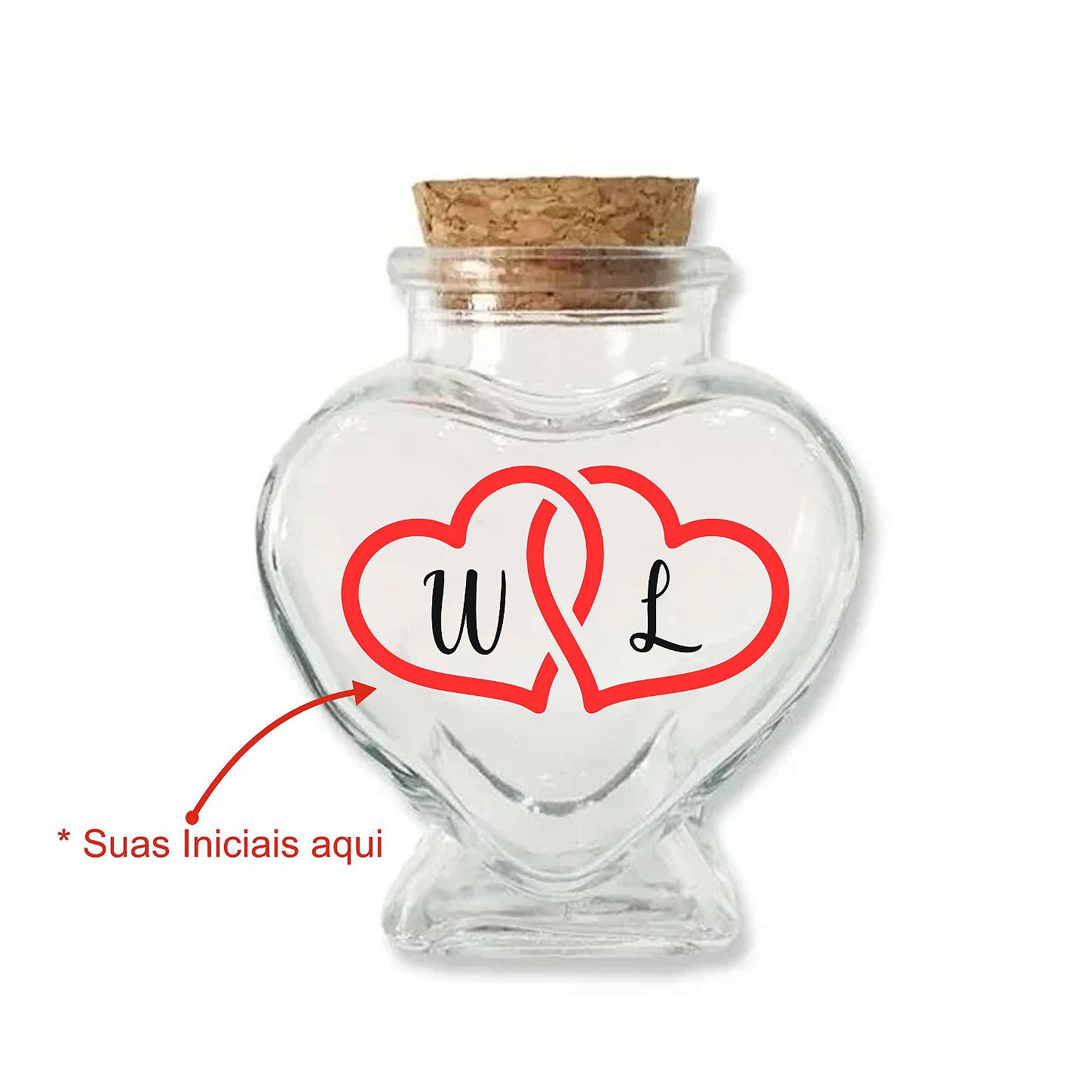 Potinho de vidro em formato de coração com rolha, personalizado para casamento. Capacidade de 70ml. Medidas: 6cm x 7cm.