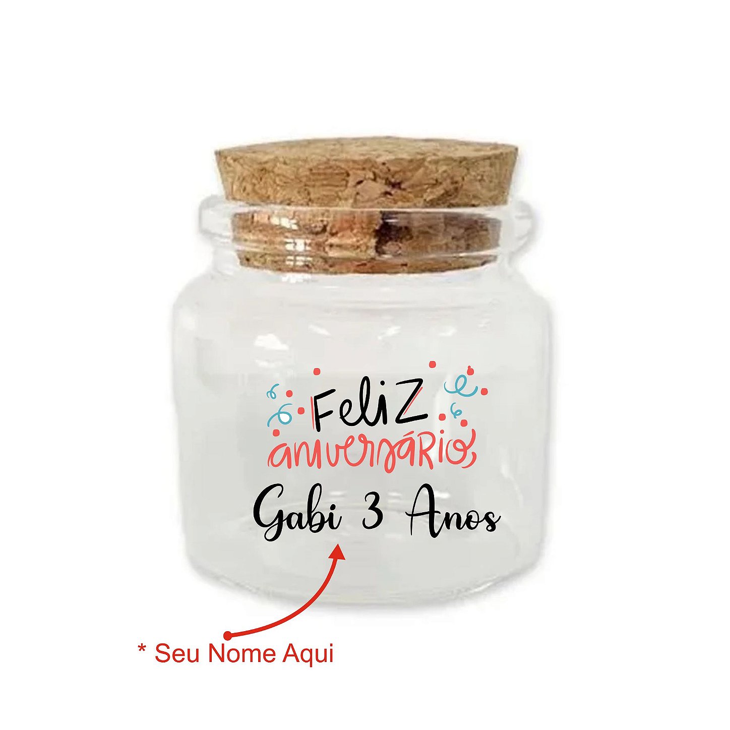 Kit Potinho de Vidro Personalizado de Aniversário com Tampa de Rolha 50ml - 4,5cm - 24 unidades - Rizzo