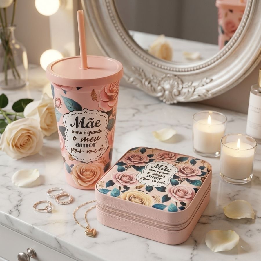 O copo possui capacidade de 600ml e dimensões aproximadas de 9,5 x 16 x 9,5 cm, sendo ideal para consumir água, sucos, chás gelados ou outras bebidas com mais praticidade graças à tampa e canudo. Já o mini porta-jóias portátil mede cerca de 9,5 x 4,5 x 9,5 cm, oferecendo um espaço compacto e funcional para organizar anéis, brincos, colares e pequenos acessórios. Versátil e encantador, esse kit é perfeito para presentes de Dia das Mães, lembranças afetivas, kits de autocuidado ou brindes especiais, unindo utilidade, organização e um gesto especial de carinho.