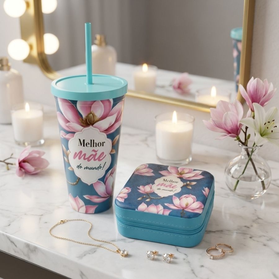 O copo possui capacidade de 600ml e dimensões aproximadas de 9,5 x 16 x 9,5 cm, sendo ideal para consumir água, sucos, chás gelados ou outras bebidas com mais praticidade graças à tampa e canudo. Já o mini porta-jóias portátil mede cerca de 9,5 x 4,5 x 9,5 cm, oferecendo um espaço compacto e funcional para organizar anéis, brincos, colares e pequenos acessórios. Versátil e elegante, esse kit é perfeito para presentes de Dia das Mães, lembranças afetivas, kits de autocuidado ou brindes especiais, unindo utilidade, organização e um gesto de carinho.