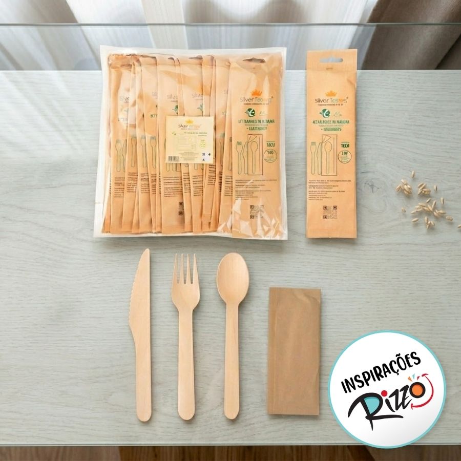 Feitos de madeira de alta qualidade, esses talheres são duráveis, leves e perfeitos para uma opção mais ecológica em vez de talheres plásticos. O guardanapo acompanha o conjunto, garantindo maior conforto e funcionalidade para os seus convidados.