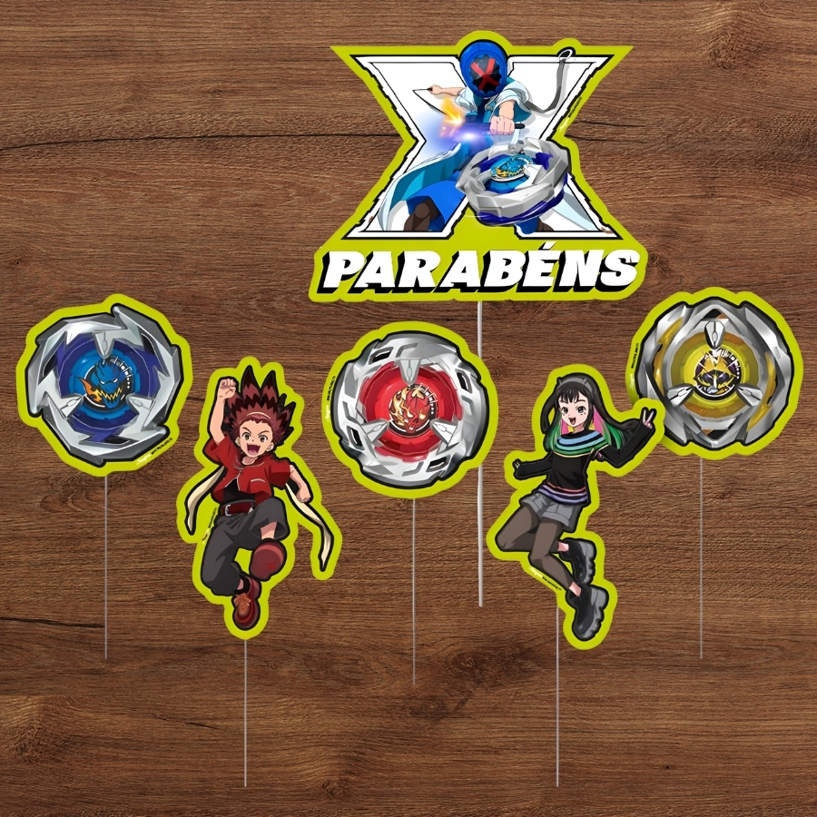 Kit topo de bolo temático Beyblade X, medindo 22x12cm. Ideal para decorar bolos em festas e aniversários infantis, proporcionando um visual divertido e personalizado.