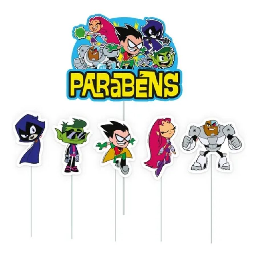 Kit topo de bolo Jovens Titãs GO!, com 6 peças — um topo maior com todos os personagens e a palavra “Parabéns”, e cinco topos menores, cada um com um personagem diferente. Ideal para decorar bolos em festas infantis com tema dos Jovens Titãs, trazendo muita cor e personalidade à mesa principal.